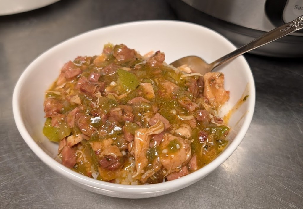 - When InstantPot is done, strain all the veggies and meat out of the broth, then set the InstantPot on low saute for 30 minutes. Add in the roux and gumbo file, and whisk together until smooth. Add back in all the veggies and meat. Also add the okra. Once the 30 minutes are up, serve over white rice.