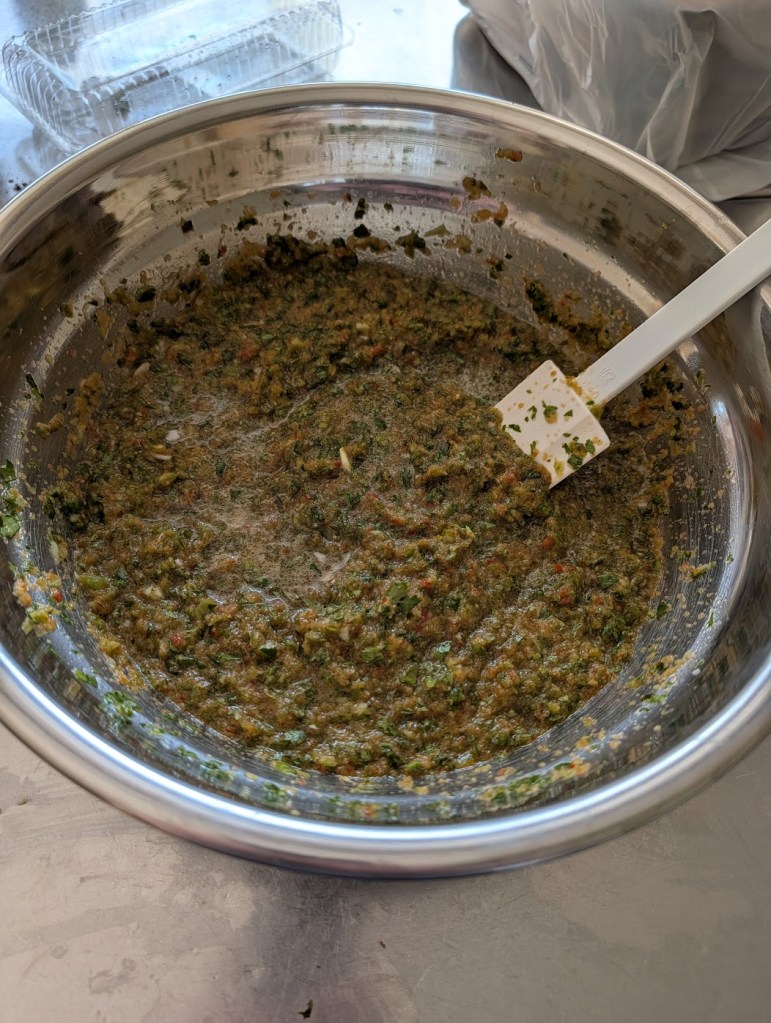 - Sofrito: To make the sofrito, de-seed and lightly chop all the tomatoes/onions/peppers, remove the skin from all the garlic, toss in your food processor and blend until a fine puree. Add in Kosher Salt and Olive Oil. Once that is done, pour out of food processor, then add in Culantro AND Cilantro (there is a difference); make sure you have only added the leaves, not the stems. Blend in food processor for a few pulses until all the leaves have been minced, you don’t want them reduced to a paste. Stir together with vegetable puree. Divide into 3 containers, one will be used for your beans, the other 2 can be frozen for future use. Finished Sofrito should look like the following:
